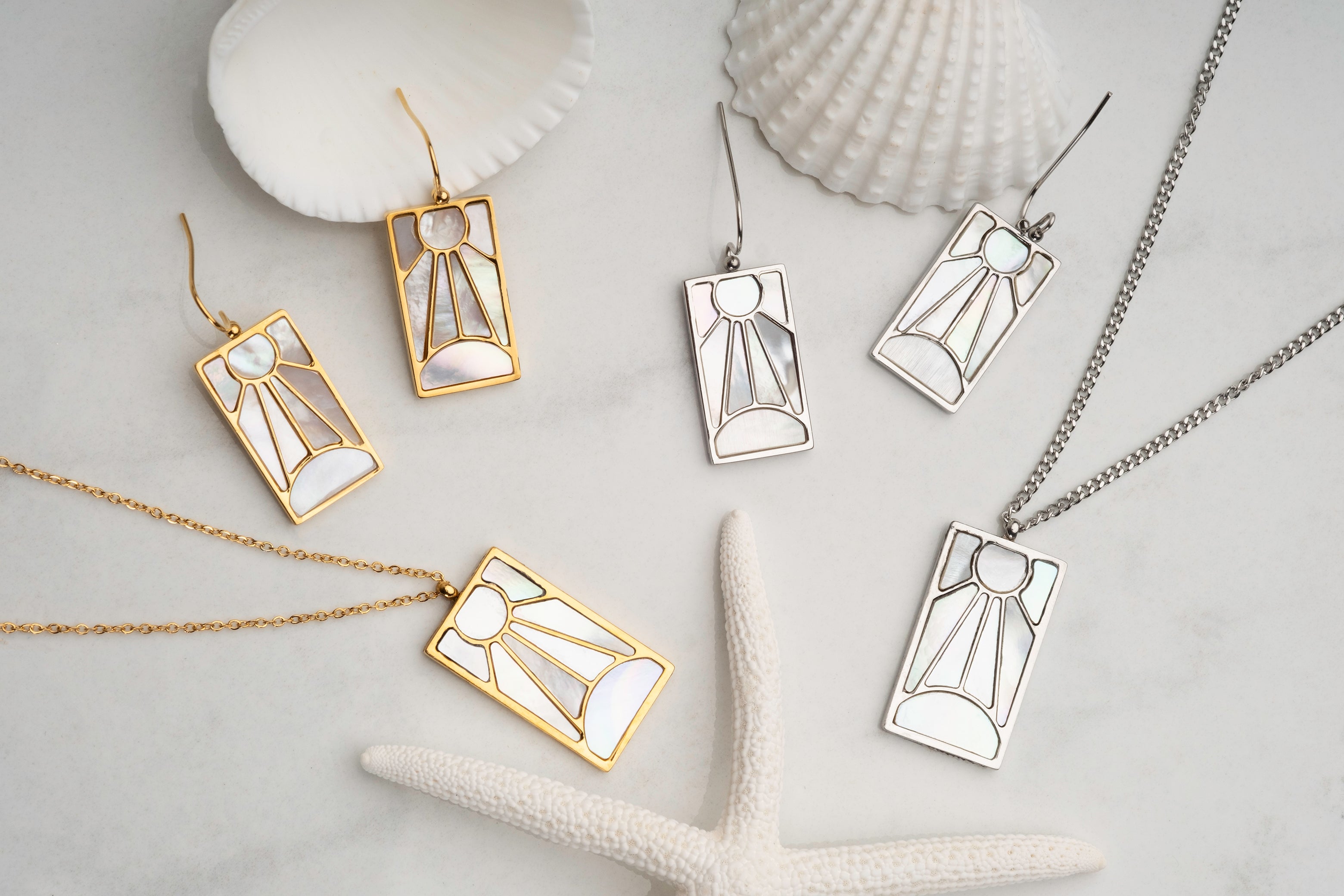 the pearl detail is gorgeous in real life. the necklace sits flat and the earrings don't feel heavy at all .zero irritation on my ears.